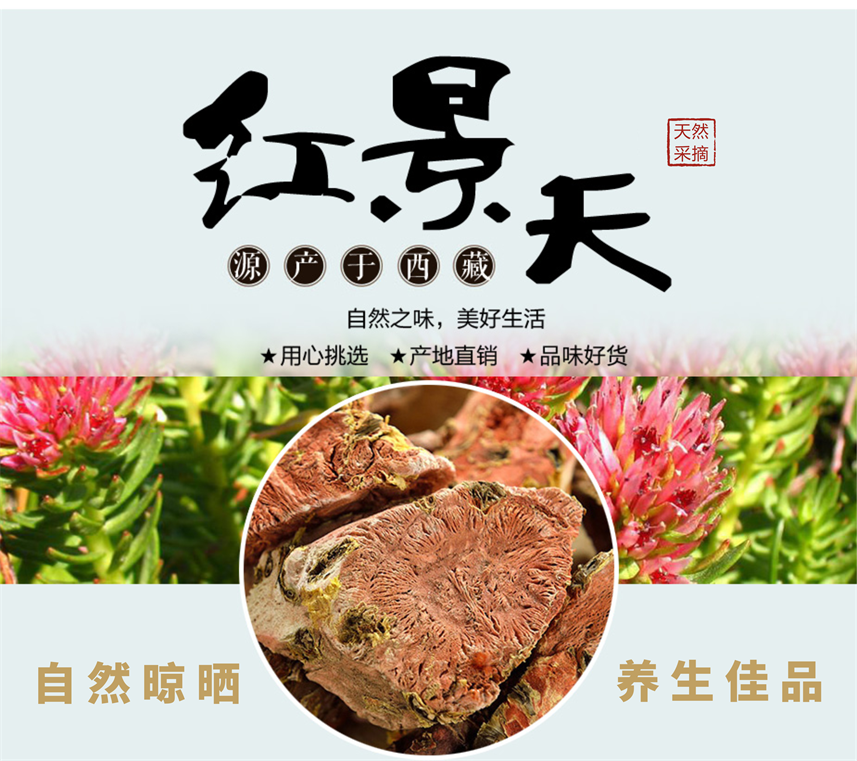 紅景天,中藥名。為景天科大花紅景天的干燥根和根莖,秋季花莖凋枯后采挖,除去粗皮,洗凈,曬干。紅景天的根莖呈圓柱形,粗短,略彎曲,少數(shù)有分枝,長(zhǎng)5~500px,直徑2.9~112.5px。表面棕色或褐色,粗糙有褶皺,剝開(kāi)外表皮有一層膜質(zhì)黃色表皮且粉紅色花紋,宿存部分老花莖,花莖基部被三角形或卵形膜質(zhì)鱗片,節(jié)間不規(guī)則,斷面粉紅色至紫紅色,有一環(huán)紋,質(zhì)輕,疏松。主根呈圓柱形,粗短,長(zhǎng)約500px,上部直徑約37.5px,側(cè)根長(zhǎng)10~750px;斷面橙紅色或紫紅色,有時(shí)具裂隙。氣芳香,味微苦澀、后甜。